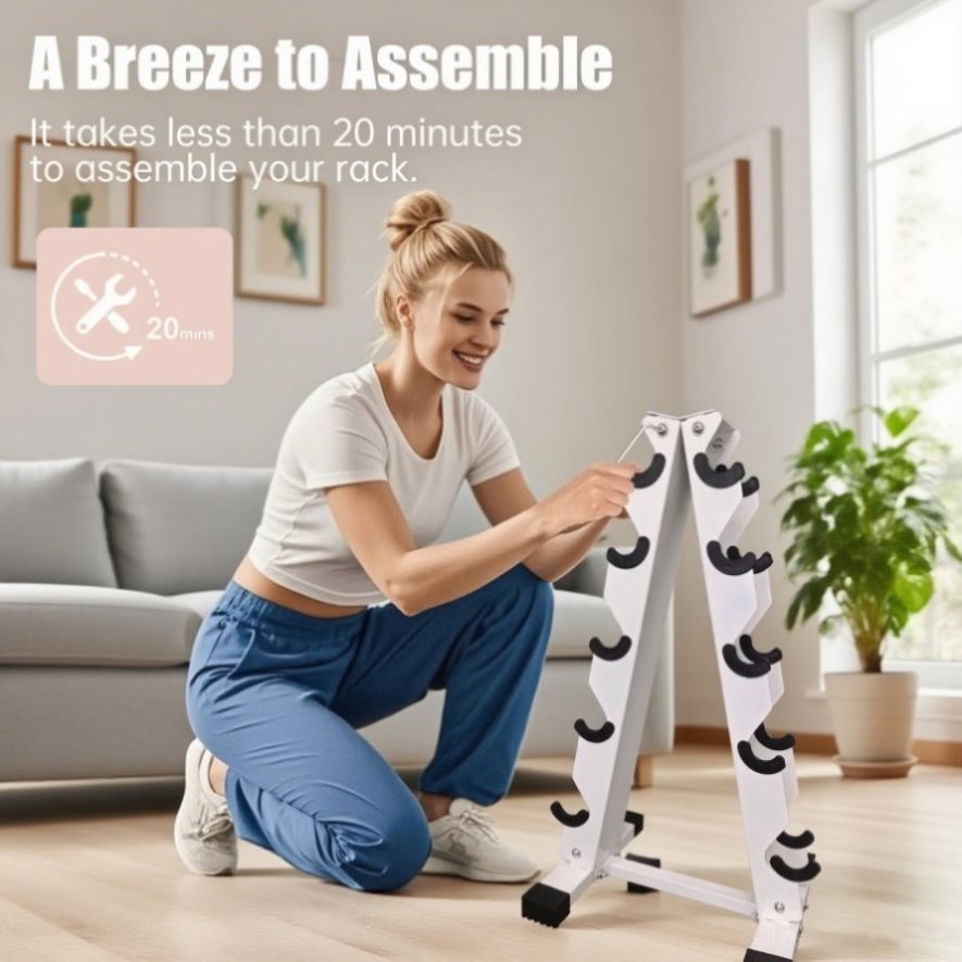 Smart 5-15lb Progressive System From beginners (5lb) to advanced users (15lb), this dumbbell set covers full-body workouts. Compact rack stores weights vertically, labeled for quick access.