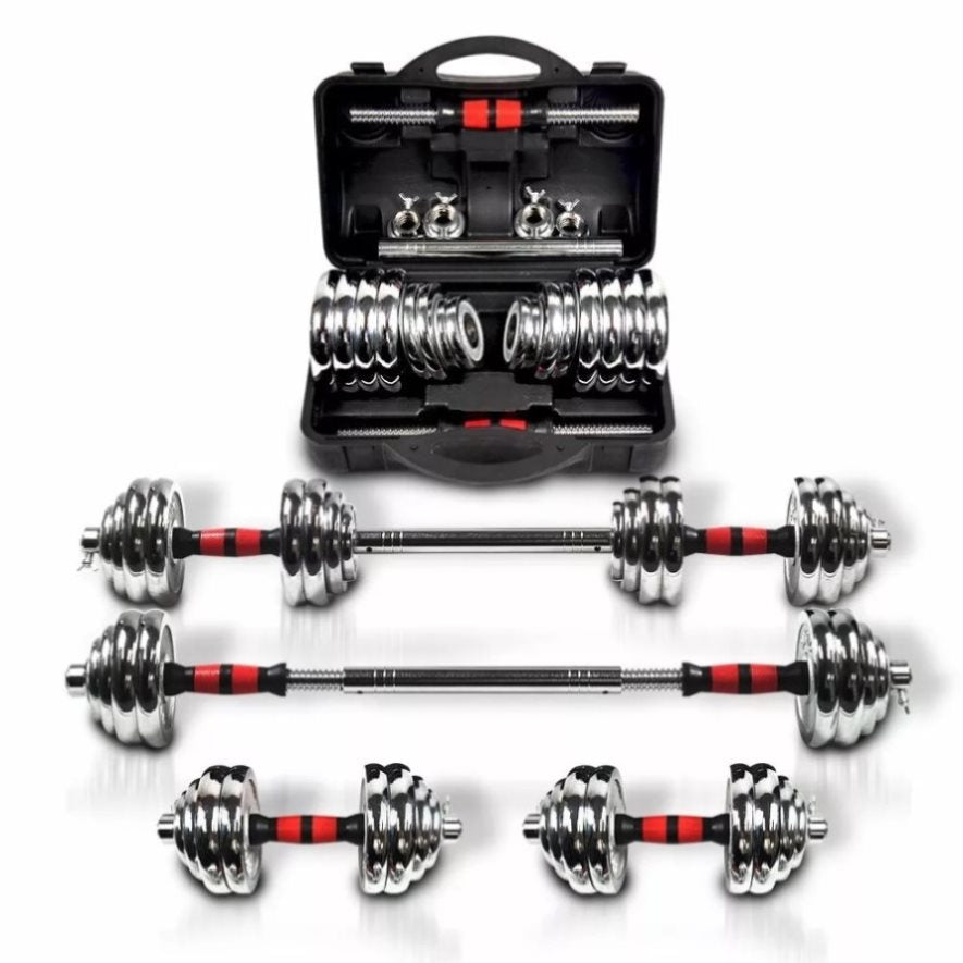 Our all-in-one dumbbell-barbell set allows you to have a versatile workout. The dumbbells can be used to sculpt your arms, while the barbell setup allows you to practice dead-lifts or squats. This product is perfect for improving overall health or encouraging weight loss. It also helps strengthen the upper body, core muscles, and lower body. The adjustable design makes it easy to stay fit at home