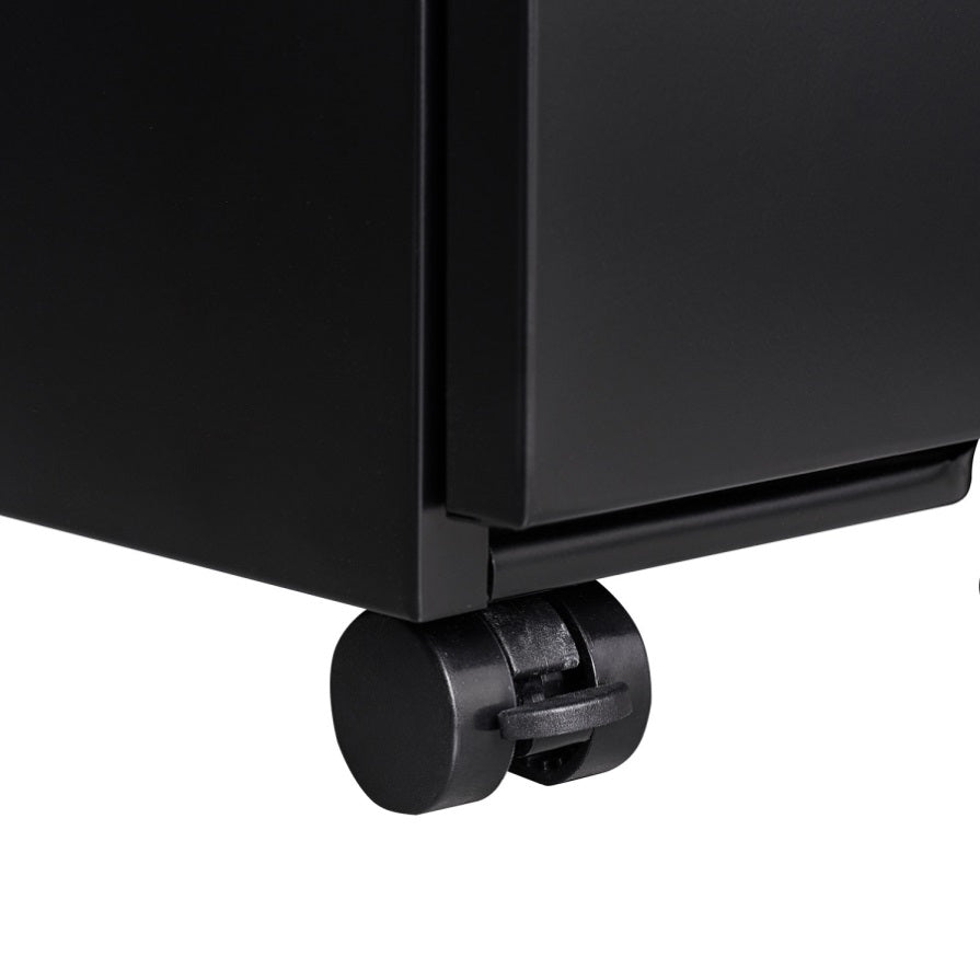 This mobile filing cabinet comes with five casters, including two front casters with brakes and one central caster to prevent tipping.