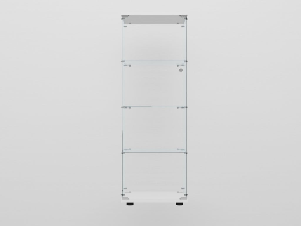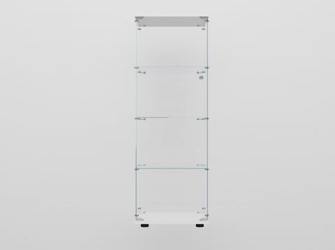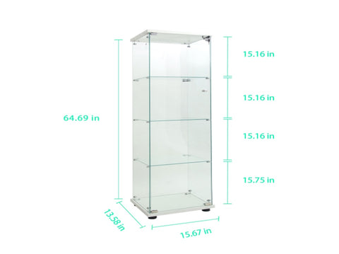 Tempered Glass Display Cabinet: Measures 64.69" (H) x 15.67" (L) x13.58" (W), with an overall weight capacity of 110 lbs, each tempered glass shelf can hold up to 11 lbs, Color: white