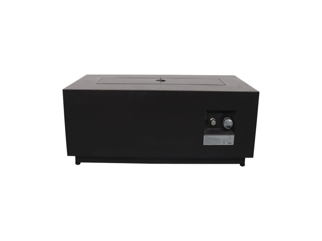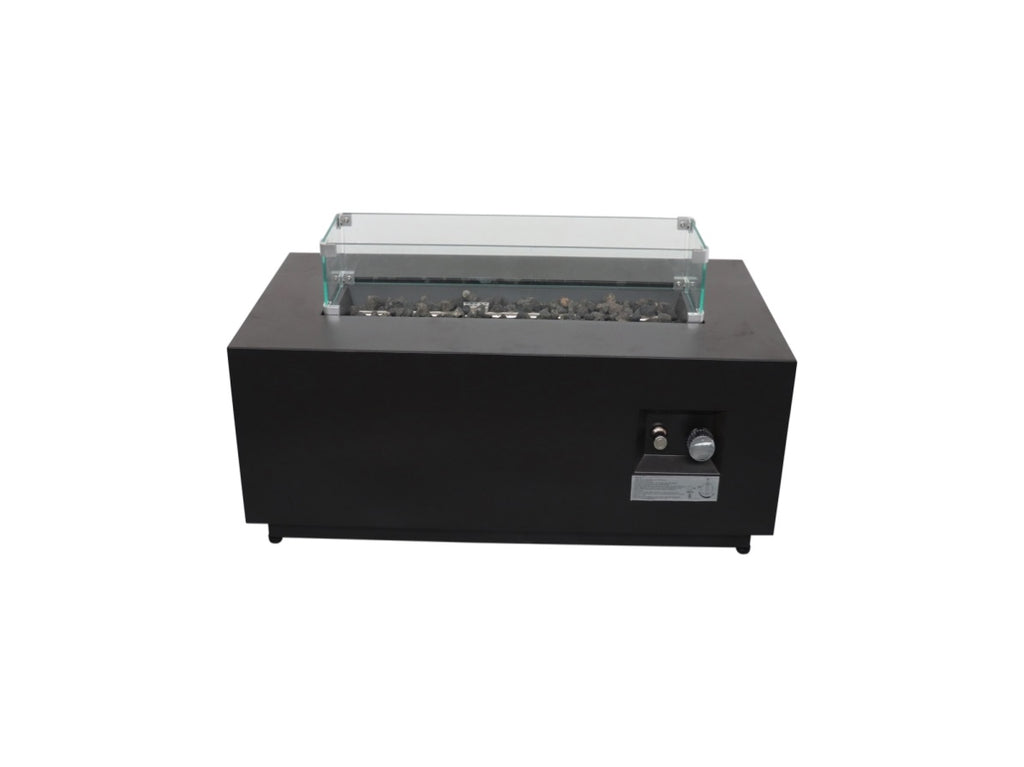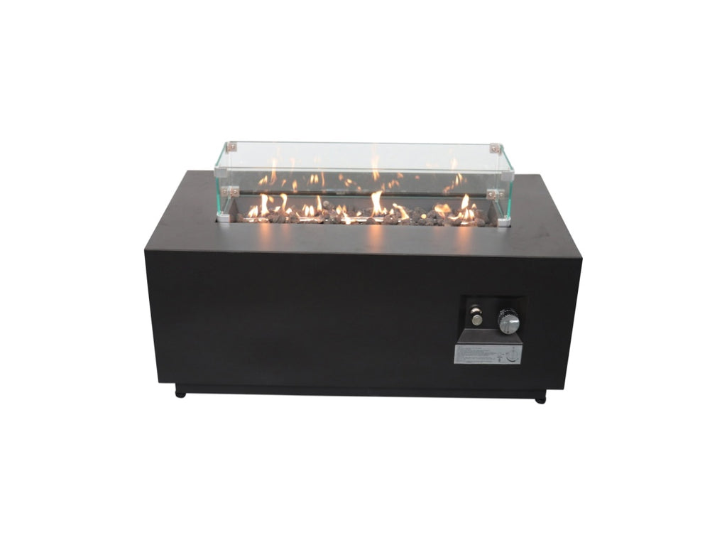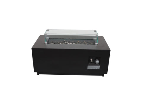 This modern fire pit table warms your patio or balcony with a streamlined design. It's made of stainless steel in a powder-coated finish with an easy-to-use push-button ignition. This fire pit table features a clean-lined rectangular shape with a shallow pit surrounded by transparent glass shields that diffuse the firelight from the propane- or natural gas-fueled flames. Side dials let you adjust the flames to your desired height. We love that this weather-resistant table comes with a cover to keep it safe from the elements when not in use. What's Included Filler Lid Cover