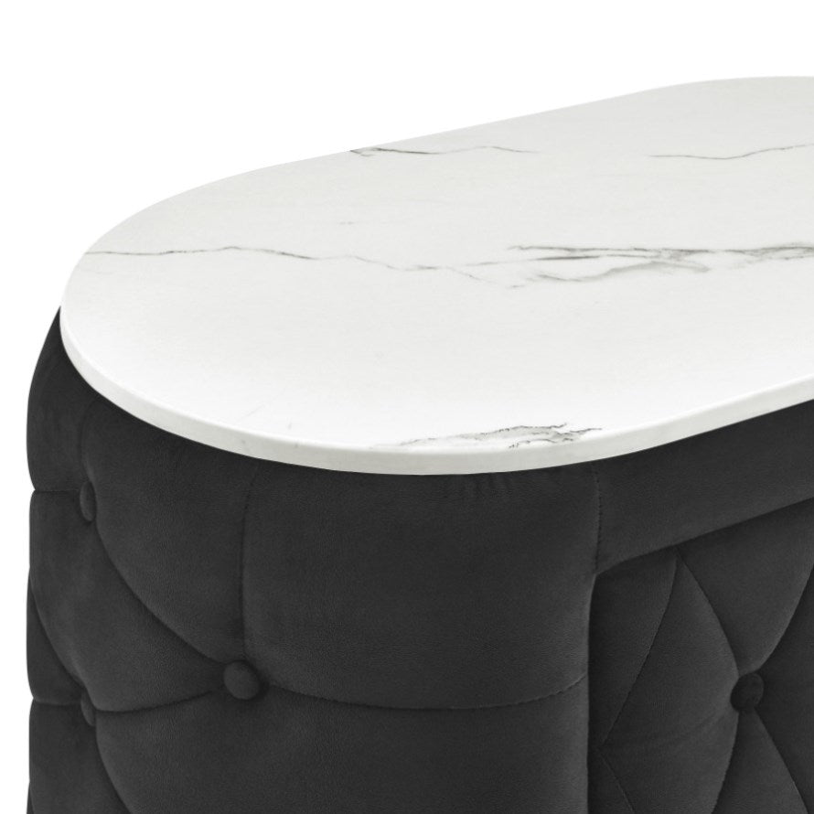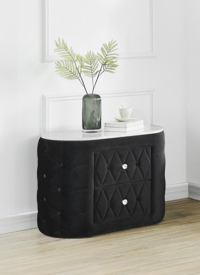 Features: Modern Style White Faux Marble Top Velvet Fabric Upholstery Button Tufted Faux Crystal Pull Handle Two Storage Drawers Oval Shape Black
