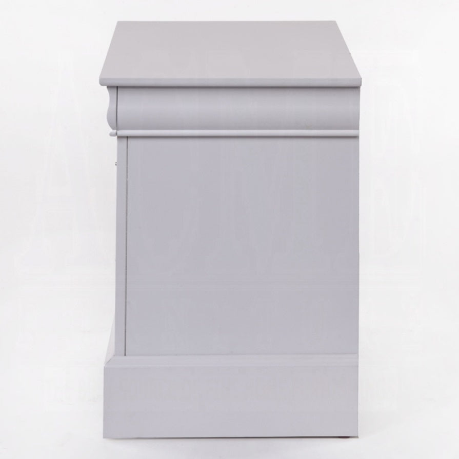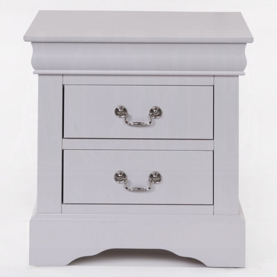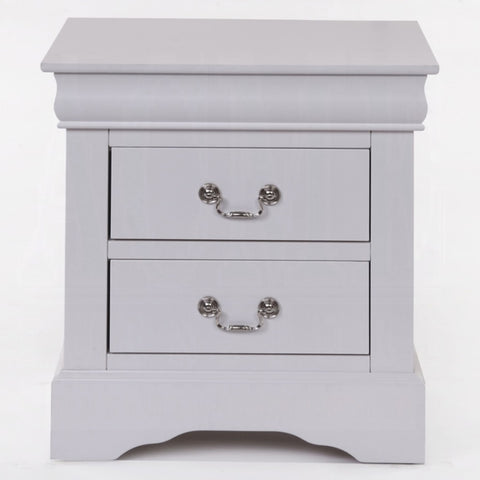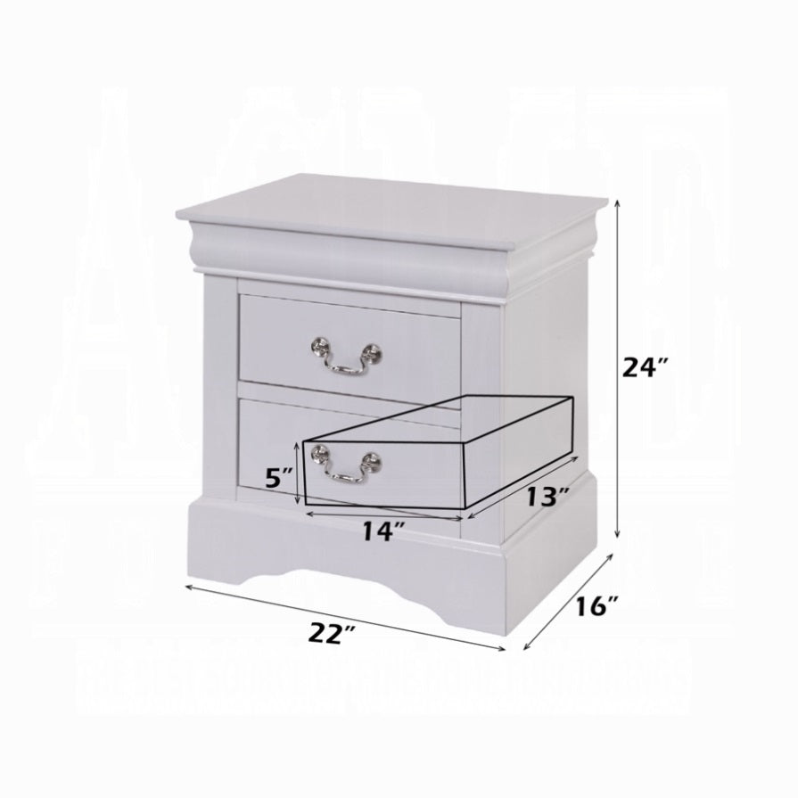 Louis Philippe inspired design two drawers nightstand offered in white finish, its drawers features center metal glide and brushed nickel tone metal handle. The design is compact and need no assembly.