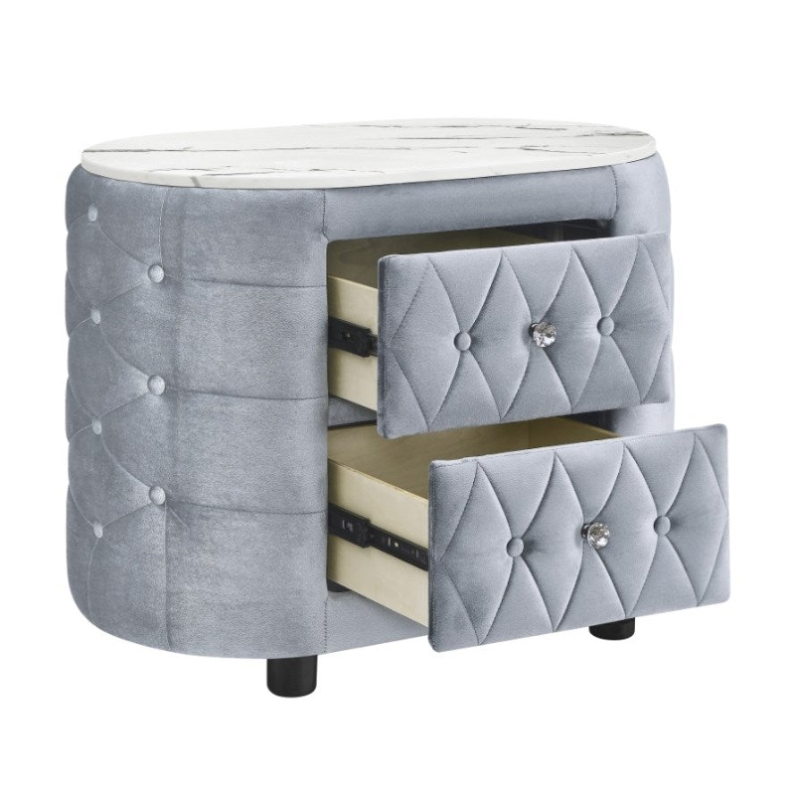 Features: Modern Style White Faux Marble Top Velvet Fabric Upholstery Button Tufted Faux Crystal Pull Handle Two Storage Drawers Oval Shape Gray