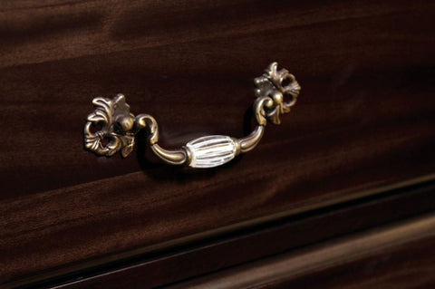 Take your bedroom set to the next level. These beautifully decorated case goods are finished in a stunning dark walnut finish. Antique brass handles with acrylic accents complete the overall luxurious look and feel.