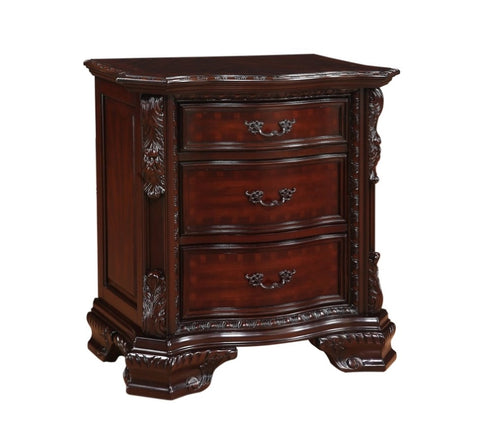 This bedside night stand sits on ornate bracket feet and has detailed carvings down the sides. The serpentine front gives the piece a very traditional look. Use the three drawers to hold personal items you want within reach of your bed or any other items you need to organize in your bedroom. Use this night stand to enhance your bedroom and more sophisticated style.