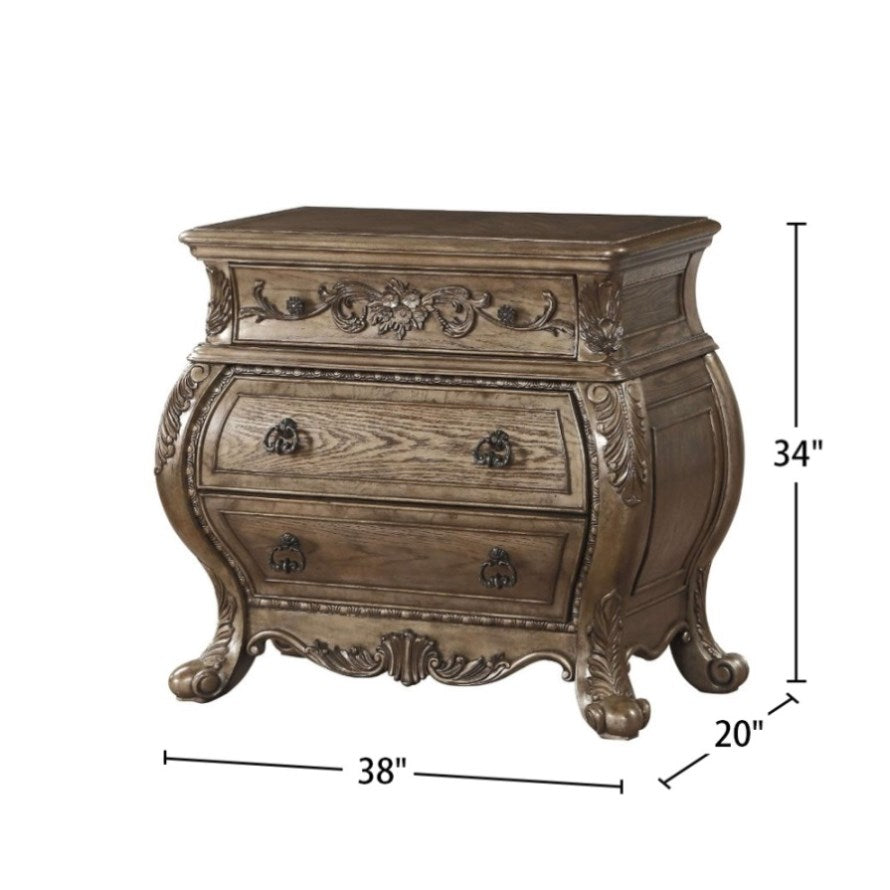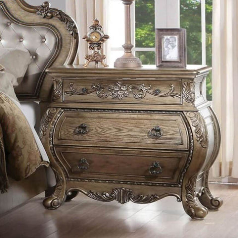 This nightstand with 3 drawers is an impeccable example of a truly memorable luxurious traditional design. With a detailed French-style front and English back in a stunning Bombay shape case, felt-lined top drawer, side metal glides, scrolled legs, and antique pull-ring handles, all these features make this beautiful nightstand bring the perfect traditional style to any bedroom. Don't hesitate to take it home.