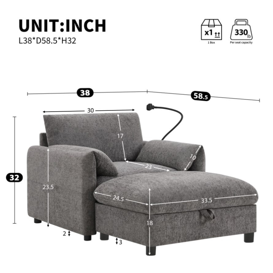 38" Single Sofa with Storage Ottoman, Adjustable Phone Holder, USB Charger, Side Storage Pockets, N723P303462E