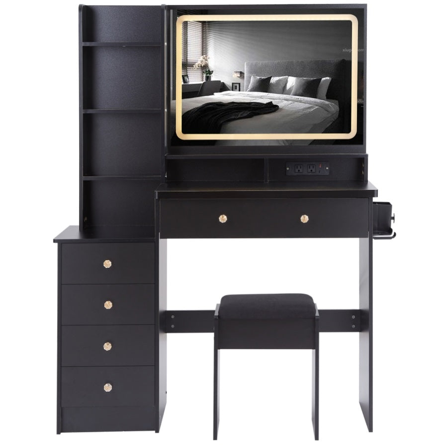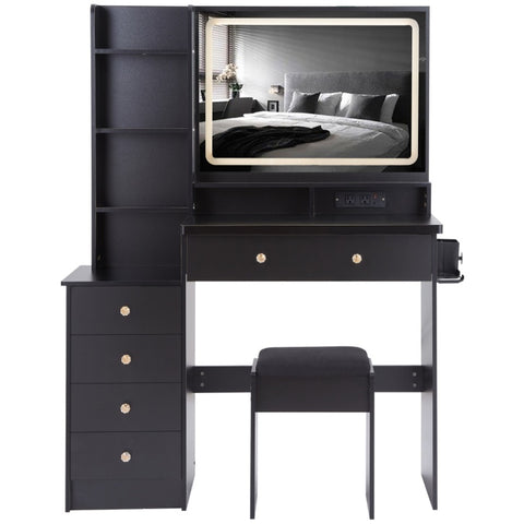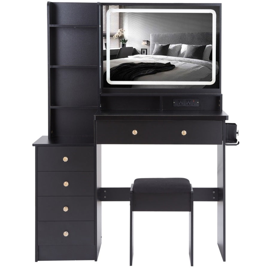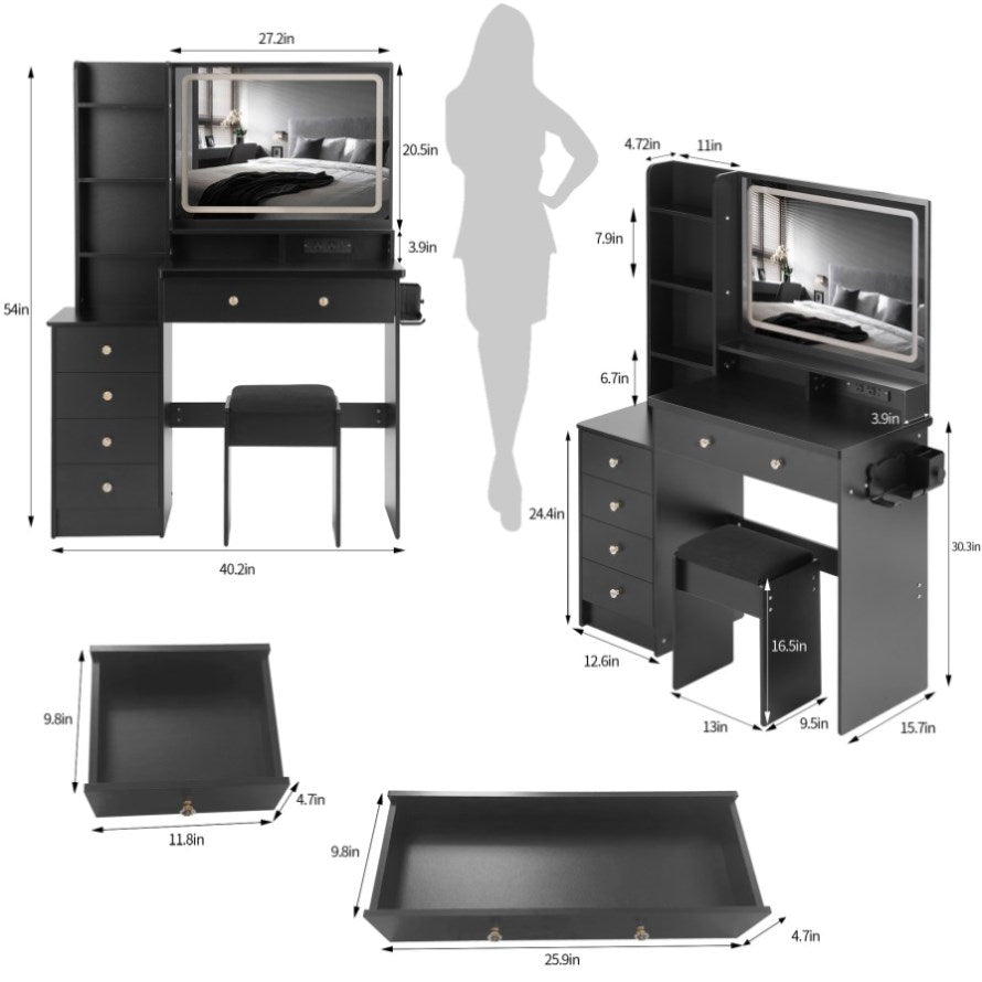 [41" length, equipped with a 27"x20" vanity mirror]: The length of the vanity table is 41", the width is 15.7", and the height is 54", equipped with a 27"x20" vanity mirror. It has a very large countertop and ultra-high storage capacity, suitable for adult use. It requires a lot of space.