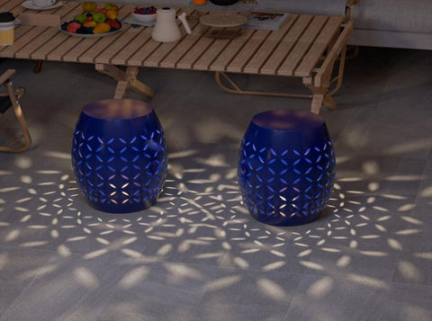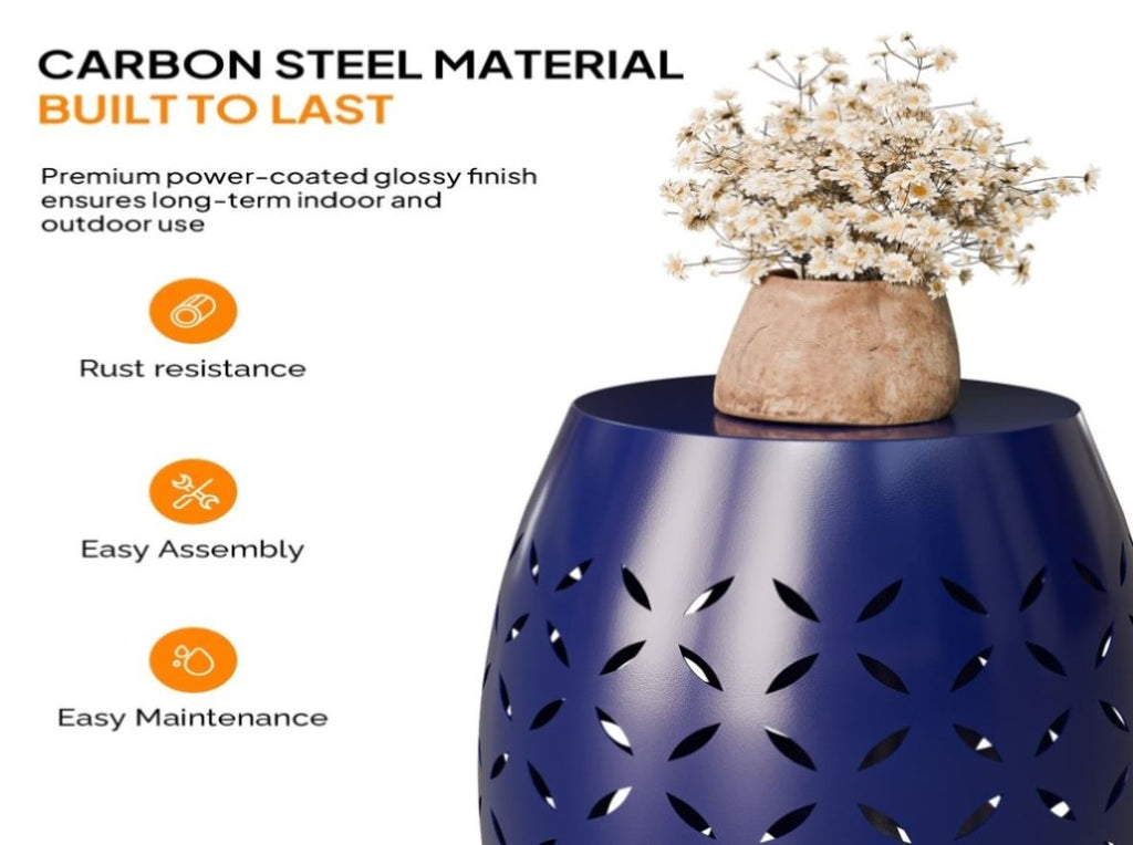 Add a touch of elegance and functionality to your space with this 9.4" Steel Patio End Table. Designed with a modern barrel shape and intricate cut-out details, this table is perfect for both indoor and outdoor use. Its powder-coated iron frame ensures durability, while the stain-resistant surface makes maintenance a breeze. Whether you use it as a chic accent for your patio, a side table for your living room, or a decorative piece to showcase plants, this versatile drum table is a must-have addition to your home.
