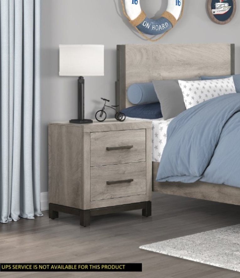 The sleek design of the Zephyr Collection pairs clean lines with modern convenience to create a style that will be the perfect palette for your design aspirations. Visually tying the nightstand together are the painted metal-finish banding of the base rail and the metal bar hardware that fronts each drawer, culminating in an accenting contrast to the gray faux wood finish of the melamine veneer.
