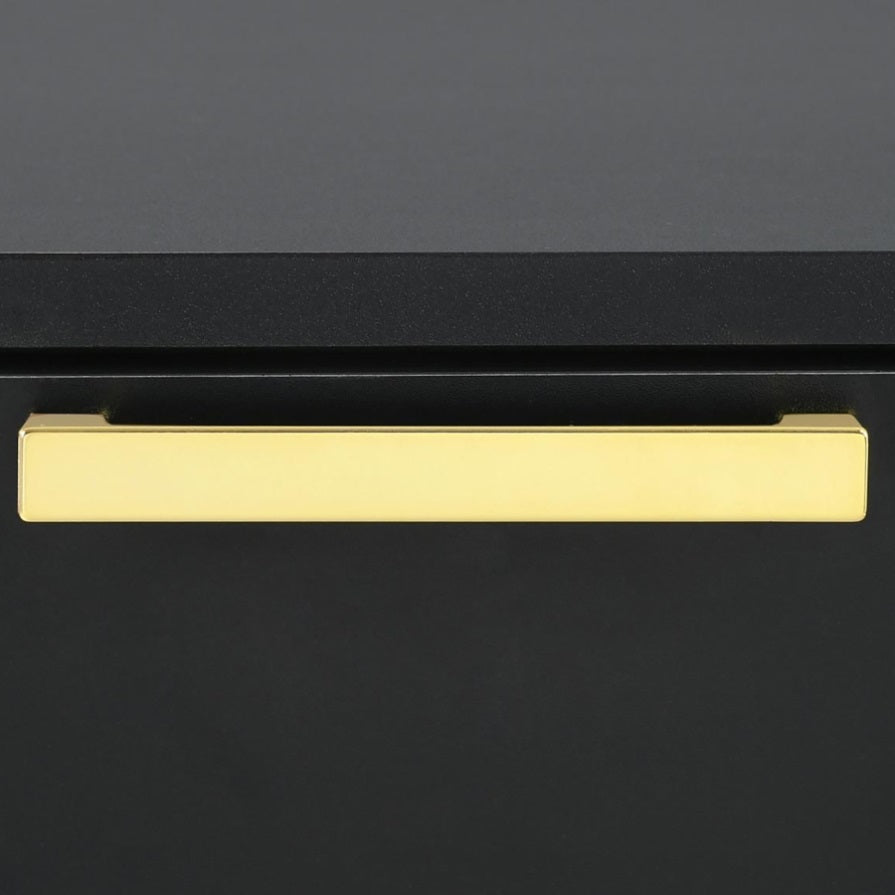 Space-saving and glamorous, this modern black two-drawer nightstand boasts beautiful gold finish pulls and gleaming golden bracket legs that present a luxurious element of surprise to your bedroom interior. A minimalist boxy silhouette contains two spacious drawers, inviting you to store away and organize everything from pajamas to bed linens to maintain a restful, neat and tidy bedroom