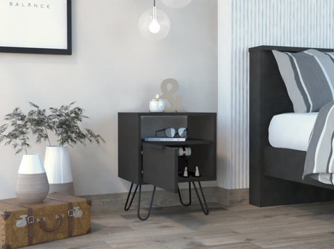 Hairpin legs lend a sleek, minimalist design with a modern industrial edge, while the black wengue finish offers a sophisticated, contemporary look by blending dark and light tones. The unit features a single drawer for organizing smaller essentials and a shelf for additional storage or display, enhancing both functionality and style.