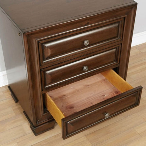 This night stand offers two solutions at once. It is visually stunning, and has unrivaled storage space to keep your fabulous new room clutter free. With three deep drawers, this nightstand can hold clothes, jewelry, and anything else necessary. The brown cherry finish and antique hardware of this piece gives it a subtle elegance. An underlight nightlight gives you enough light to see without waking anyone up.