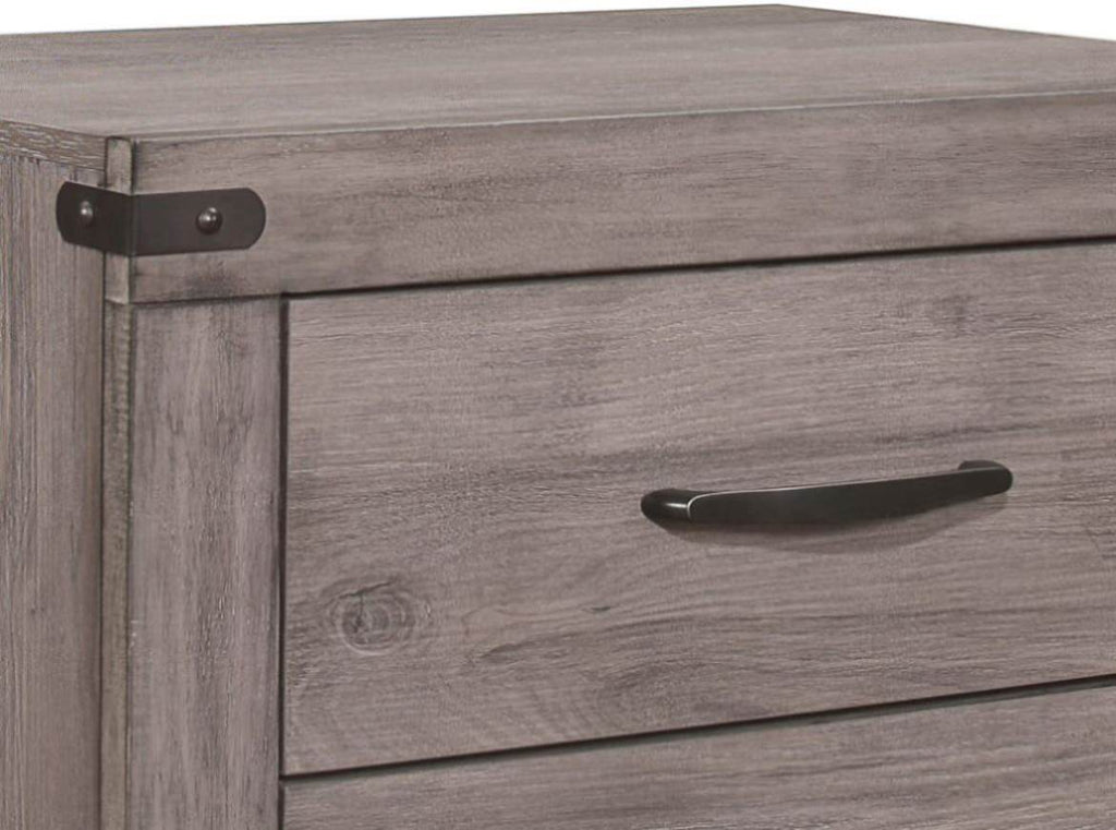 Industrial design is subtly used to achieve a cool look for your bedroom in this collection. Dark metal hardware and corner banding with rivet look lend to the casual aesthetic of this nightstand. Melamine laminate features a weathered-wood look that furthers the intended design.