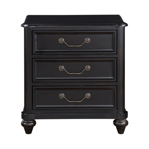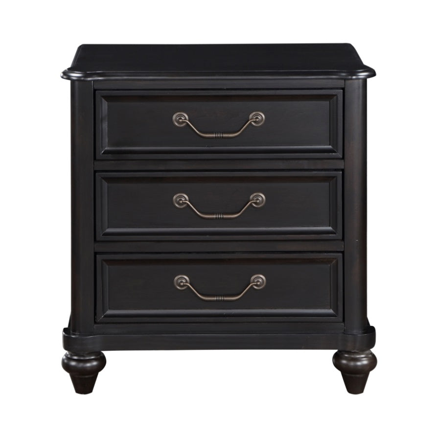 The traditional profile of the Herman Collection is achieved with a perfect blend of classic elements that create a look that complements the style of your bedroom. Turned feet provide support to the classic design of the nightstand. The piece features charcoal brown finish, over birch veneers, highlighting the beautiful wood grain. An antiqued finish lends elegant patina to the traditional hardware of the nightstand’s drawer fronts. PRODUCT DIMENSIONS: Overall Dimension: 26" x 17" x 27"H Drawer interior: 19"x12.5"x4"(3) Listing Includes: One Nightstand Only. Simple Assembly Require.