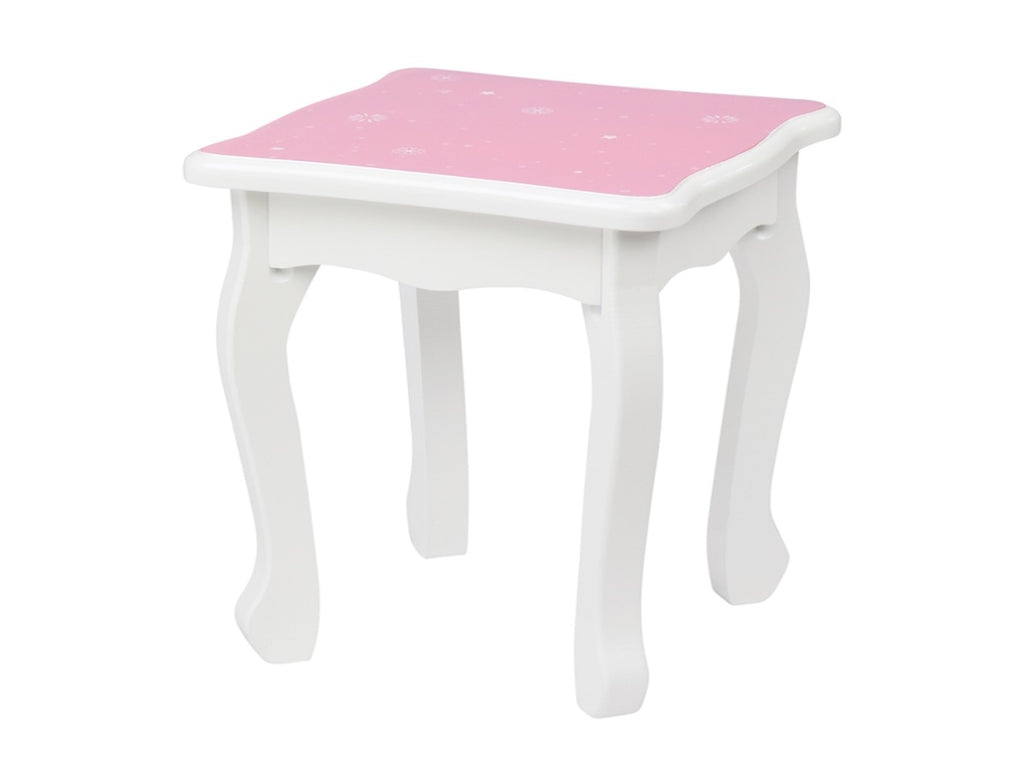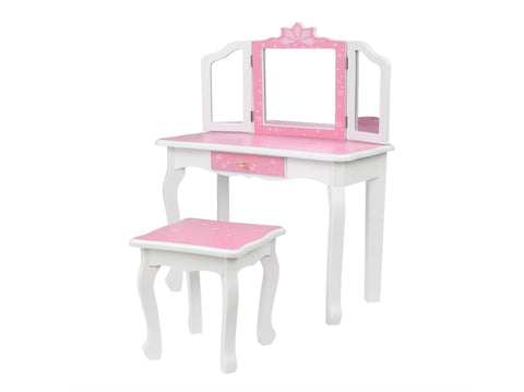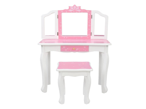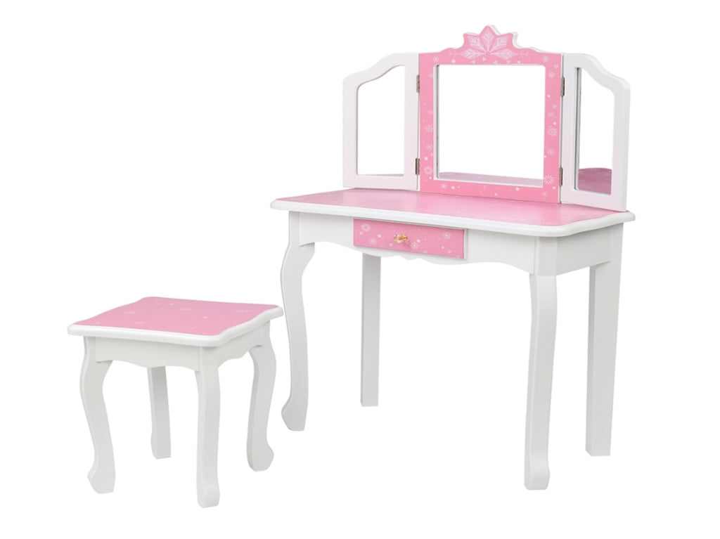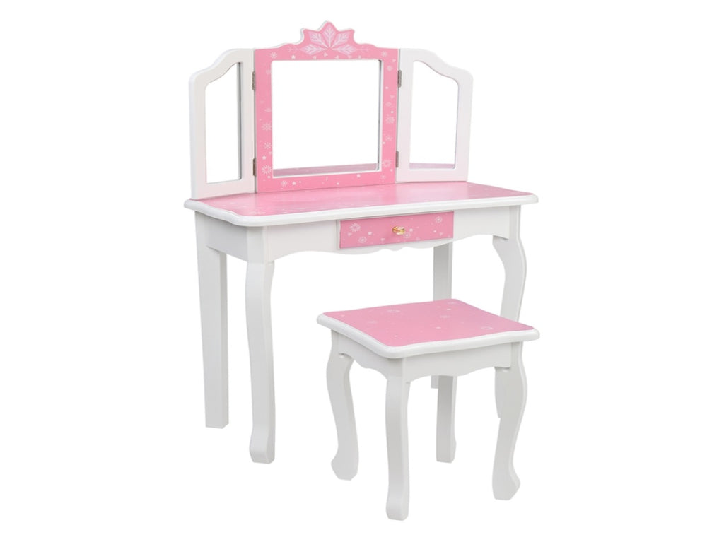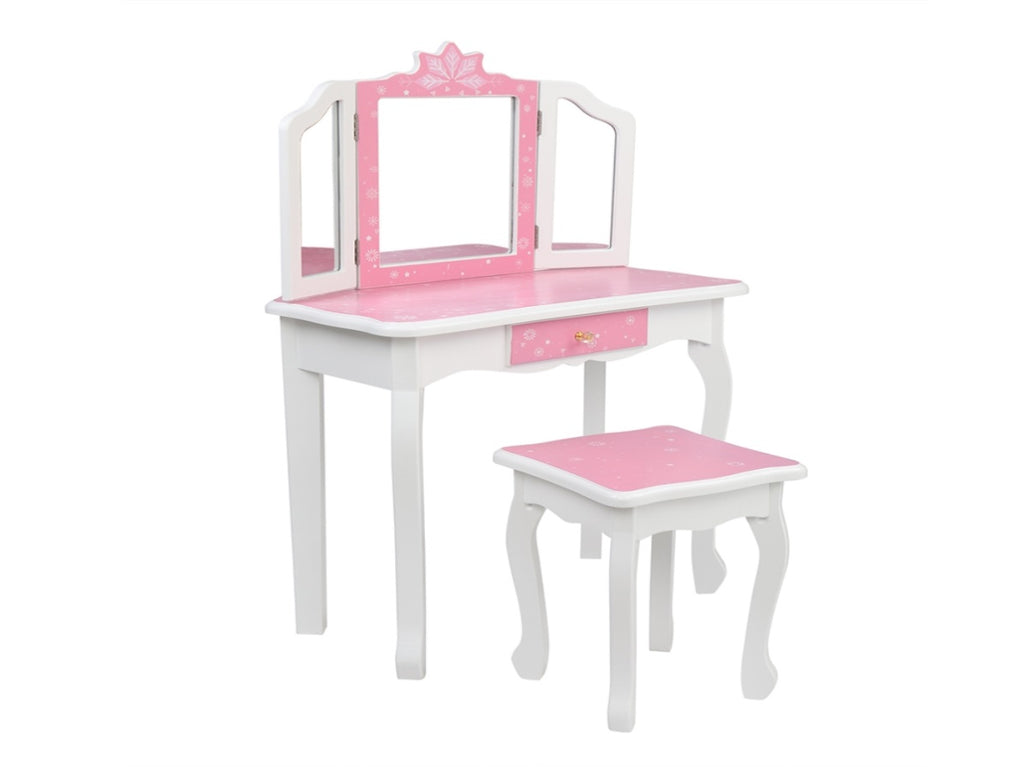 This is Children's Wooden Dressing Table. This dresser is made of high quality MDF board, which accentuates the super quality of the dressing table. Pink snowflake style make this dresser sweet and lovely. The dresser top and stool surface all adopt arc design for avoid children knock against to cause unnecessary injury. The three-fold mirror can be detachable and used as a children's desk.