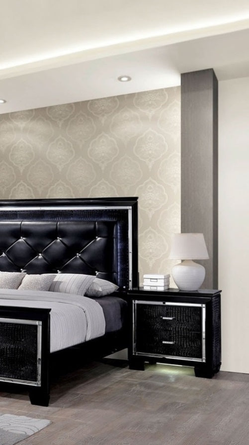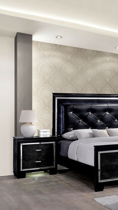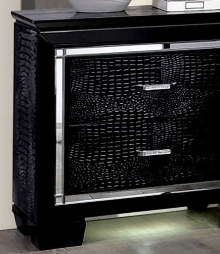 Specifically designed to accentuate a glamorous feel, this bedroom collection brings a combination of class and contemporary style to your bedroom. Crocodile embossed veneer and silver lining panels stand out throughout every piece while, the bottom of this night stand has built-in LED lights to illuminate the mood.