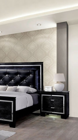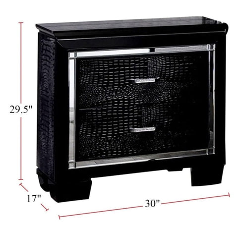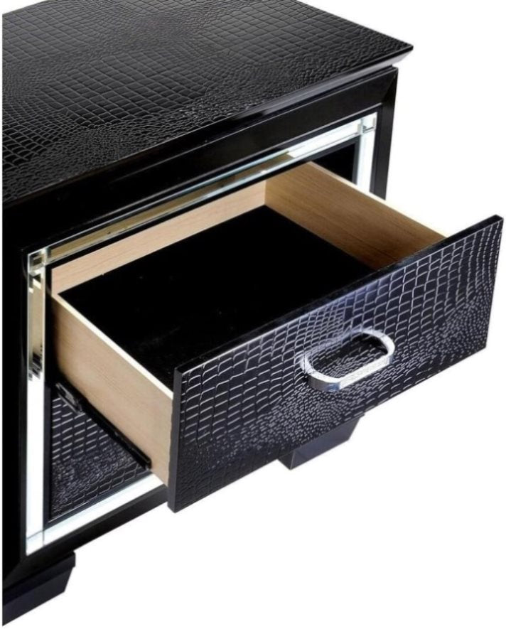 Features:- Contemporary Black Mirror, Solid Wood, Wood Veneer, Others Felt-lined Top Drawers Diamond Crusted Bar Pull Handles English Dovetail Drawer Construction LED Light on Night Stand Crocodile-Textured Detail w/ 3mm Mirror Inserts
