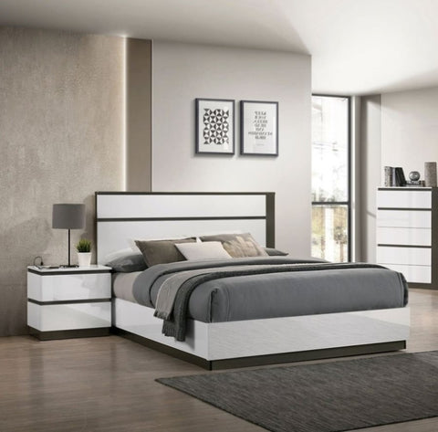 Contemporary White/Metallic Gray Solid Wood, Wood Veneer, Others Felt-lined Top Drawers Asymmetrical Two-tone Design High Gloss Finish w/ Metallic Accents USB Charger in Night Stand Ball Bearing Glides