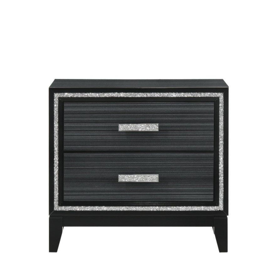 This nightstand features a rectangular tabletop and two drawers, constructed with a classic design aesthetic incorporating modern elements. Also features a glamorous shimmering silver accent trim and matching drawer handles provide a cohesive design. The black finish offers versatility for diverse bedroom decors.