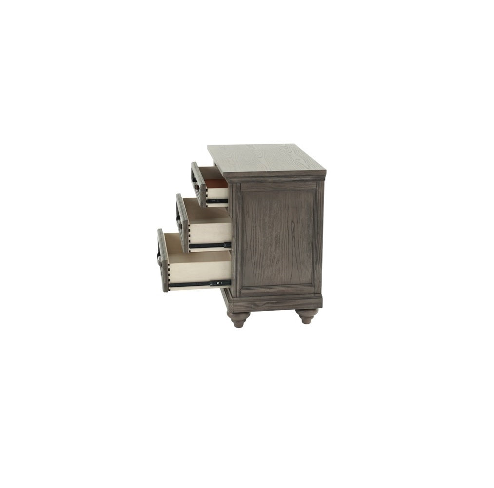 This sleek antique gray oak nightstand is the perfect addition to any bedroom. With spacious drawers, it provides ample storage for all your bedside essentials. The neutral color and modern design make it easy to match with any decor style, while the sturdy construction ensures durability for years to come. Add a stylish and functional touch to your bedroom with this versatile nightstand.