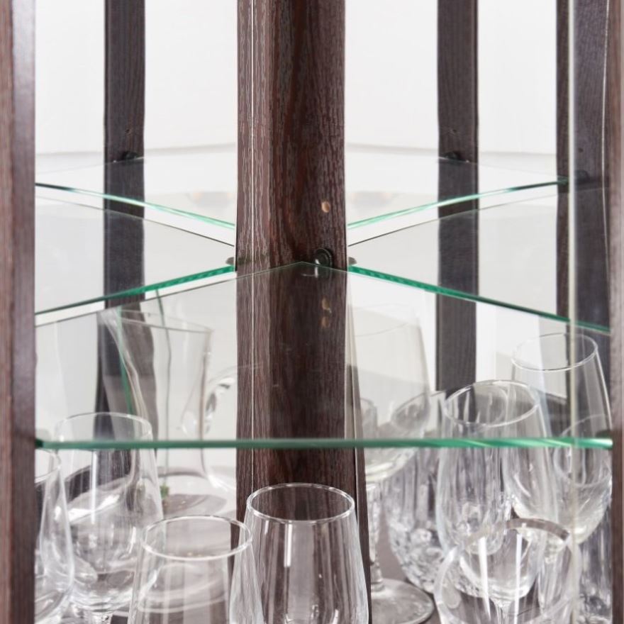 Presenting itself in a selection of Cherry or Oak, this cabinet adorned with glass doors boasts a gracefully curved and impeccably smooth silhouette. Its aesthetically pleasing design exudes an air of tranquility, imparting a soft and soothing touch to your interior decor while elegantly showcasing the items housed within.