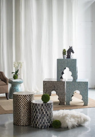 A modern take on the classic drum silhouette, this stool features a striking black finish adorned with rich gold capiz shell patterns.