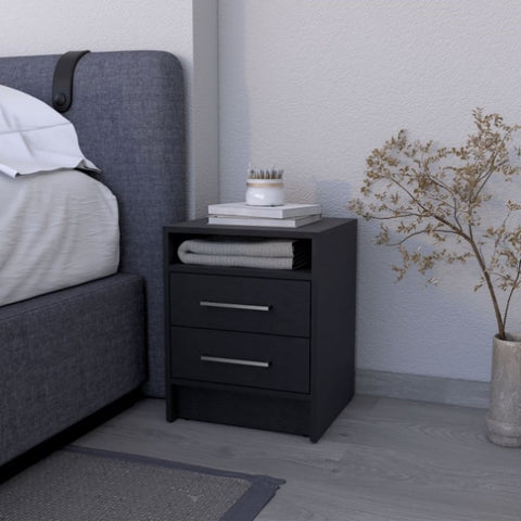 Transform your bedroom with this nightstand, the perfect blend of style and functionality. It features two spacious drawers, equipped with a total of four high-quality rails that ensure smooth and effortless operation. The open shelf provides additional storage or display space, ideal for keeping your essentials within reach. Crafted from durable melamine and particle board, this nightstand is designed to withstand daily use while maintaining its elegant appearance. Perfect for any bedroom, it offers a practical and stylish solution for all your storage needs. Elevate your bedroom decor with this versatile and sophisticated piece.