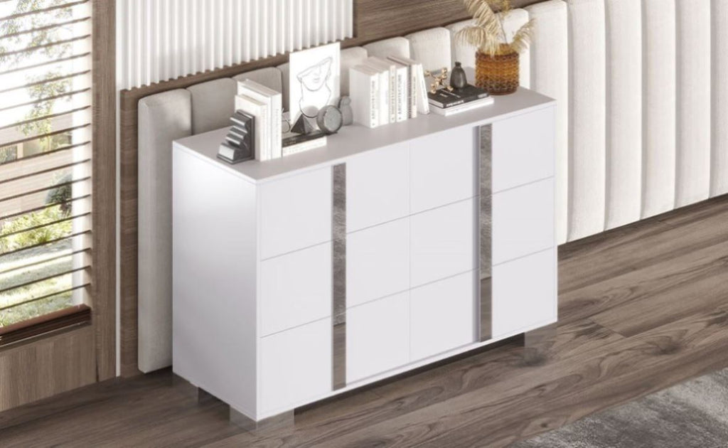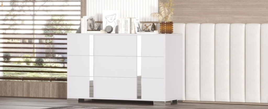 Modern Dresser with Metal Handle,Mirrored Storage Cabinet with 6 Drawers for Bedroom, White