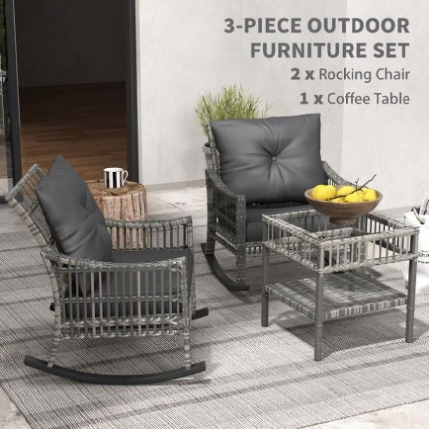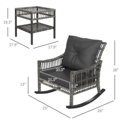 - - Three pieces wicker patio set includes two rocker chairs, and a matching coffee table with bottom storage for stylish outdoor living