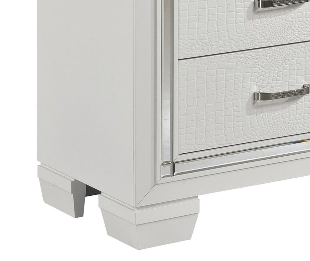 Glamour reigns in the design of the Allura Collection. Framing the nightstand is a decorative beveled mirror accent that enhances the illumination from the touch-engaged LED backlight of the nightstand. Alligator embossing and high polished crystal-enhanced hardware boldly accent the white finish.