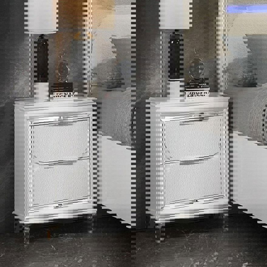 Elevate your bedroom with this glamorous pearl white nightstand. Two deep drawers, mirrored trim, and acrylic legs create a stylish, organized space. Sturdily crafted for long-term use. .
