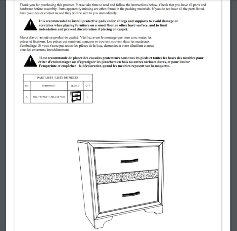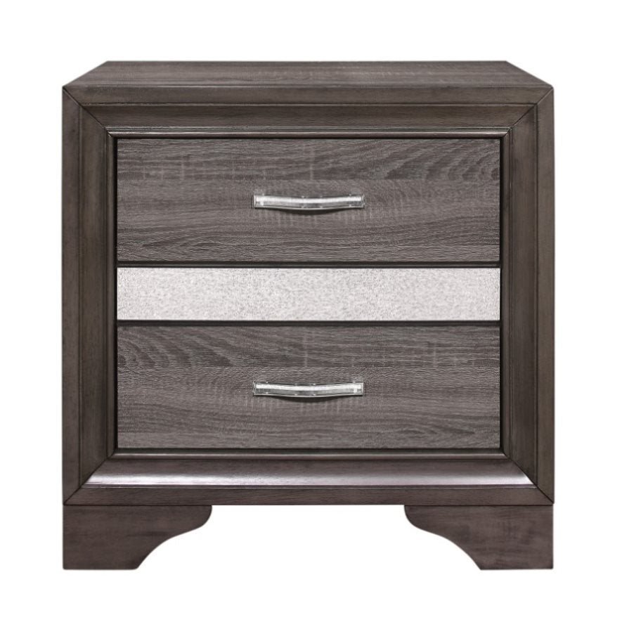 The nightstands embossed faux-wood veneer features a gray finish that allows for the acrylic silver glitter front of the hidden jewelry drawer to shine. The jewelry drawer features felt lining to protect your hidden items from wear and tear. Polished chrome bar drawer pulls front the drawers providing complementing contrast to the collections finish.
