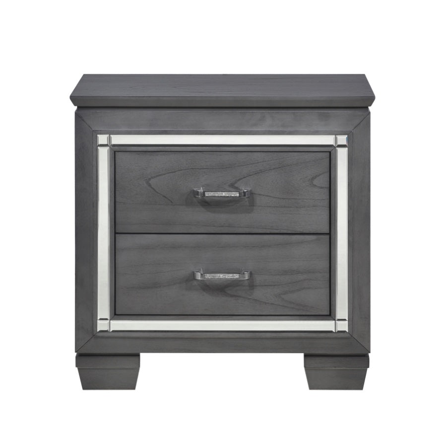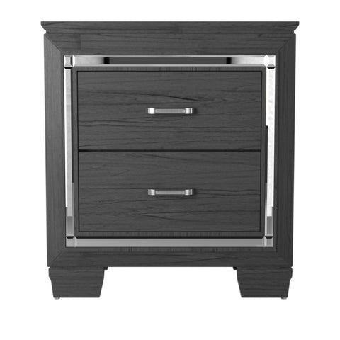 Glamour reigns in the design of the Allura Collection. Framing the nightstand is a decorative beveled mirror accent that enhances the illumination from the under-light of the nightstand. High polished crystal-enhanced hardware boldly accents the gray finish.
