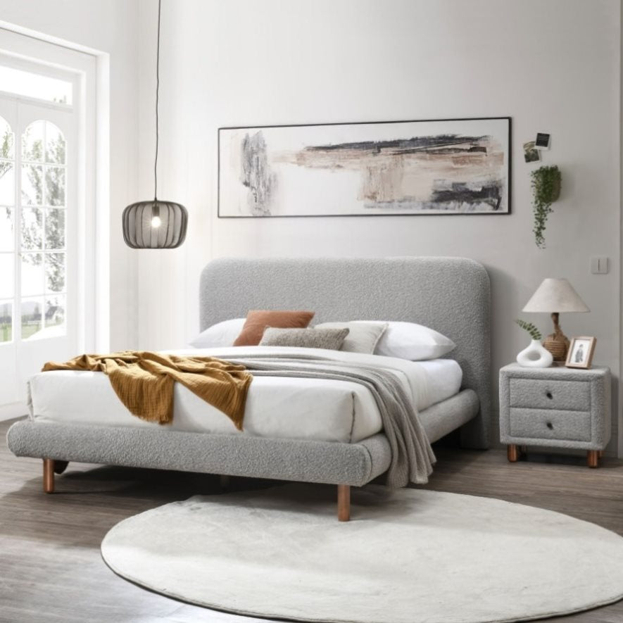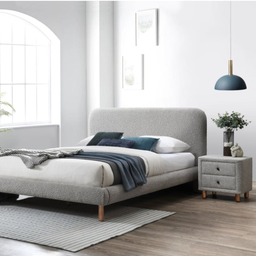This nightstand gets a chic update in textured boucle fabrication, adding a whimsical touch to any bedroom with its softly curved frame that softens the overall look while injecting a dash of trendy allure. Blending mid-century minimalism with plush boucle upholstery and wooden legs for a unique mix of styles, the nightstand offers two drawers for convenient storage of bedtime essentials.