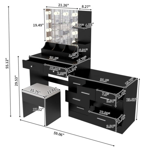 1. 2-in-1 Vanity and Dresser Combo: This multi-functional vanity combines the best of a makeup station and dresser, providing 3 storage compartments on tabletop, 9 drawers, 3 tabletop shelves, and 2 staggered tabletops to keep all your makeup, skincare, and accessories neatly organized and easily accessible.