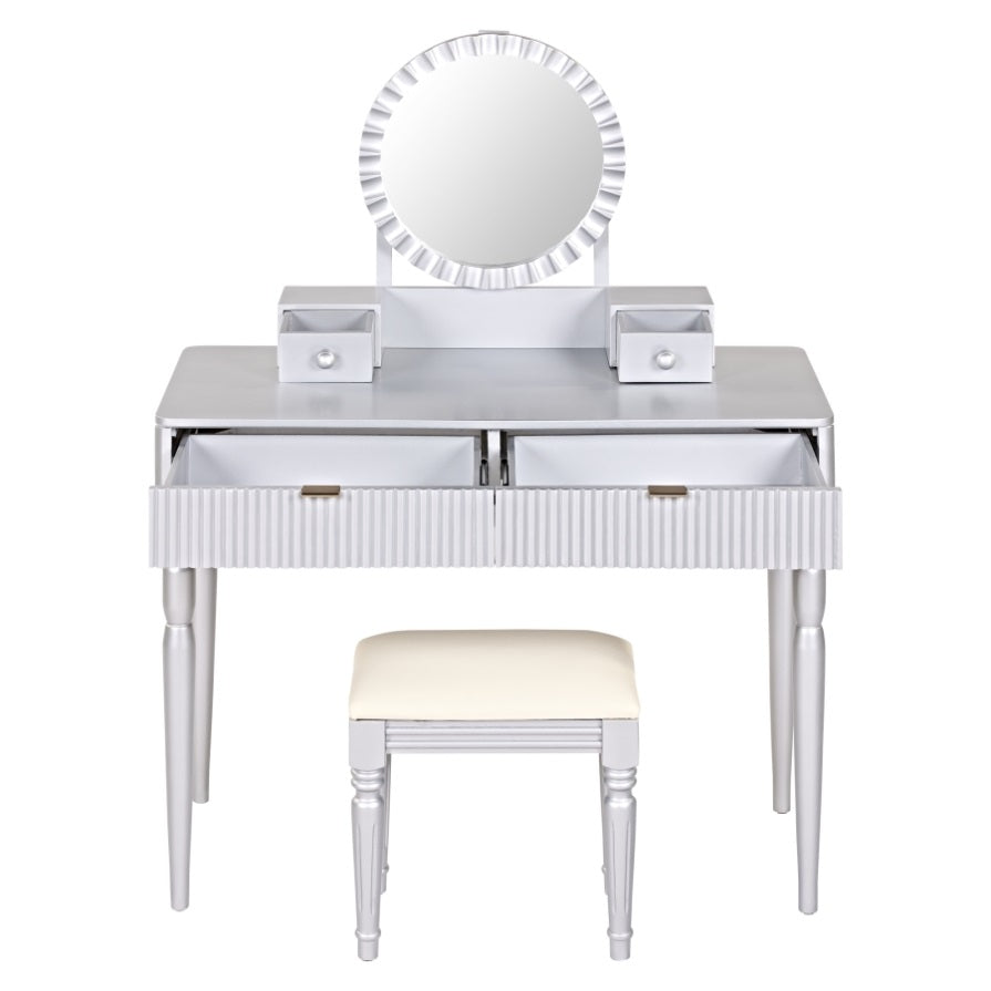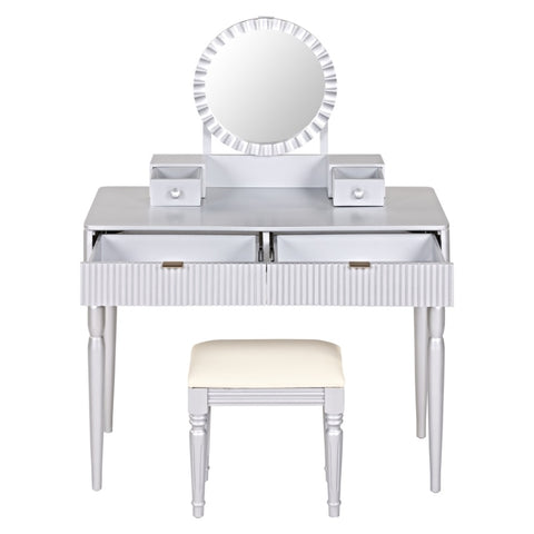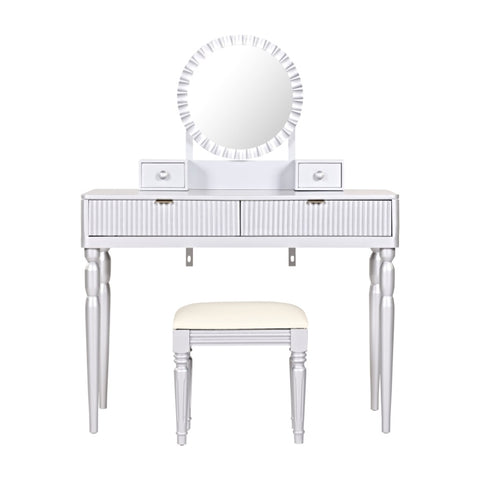 Elegant Design with Timeless Appeal: This makeup table seamlessly blends classic and modern aesthetics, featuring a sunflower-shaped mirror, strip-fluted drawer panels, and delicately carved table and stool legs. Its simple yet stylish design adds a touch of grace and elegance to any bedroom, making it an ideal choice for those who appreciate refined and classic decor.
