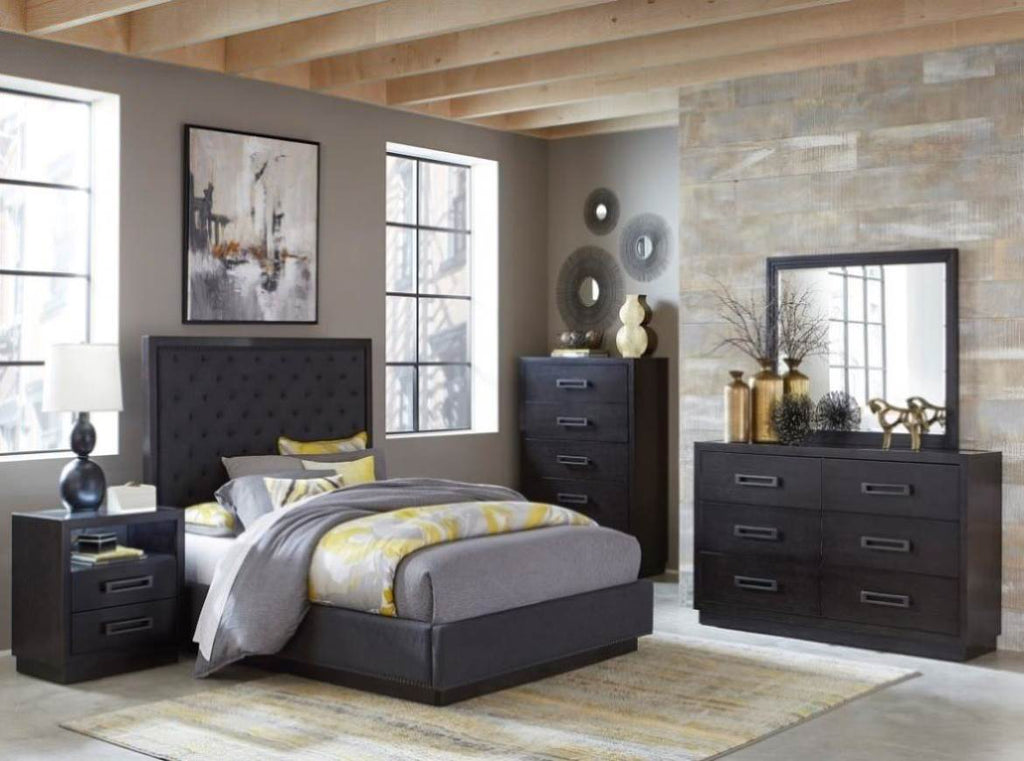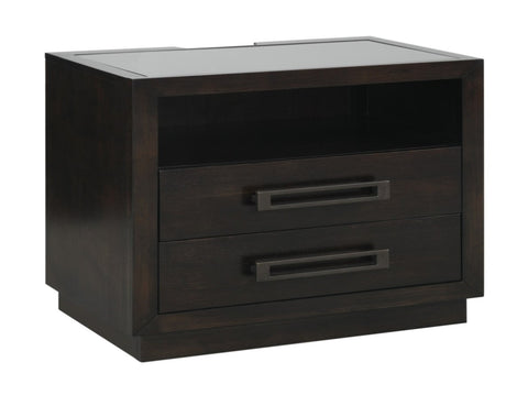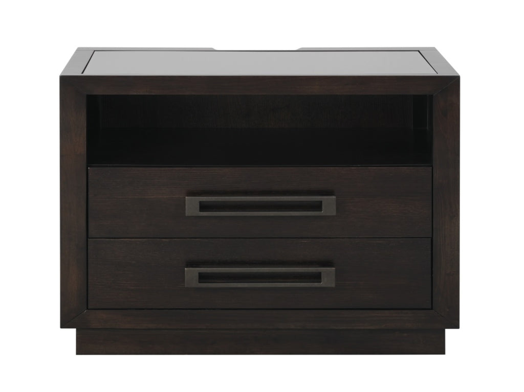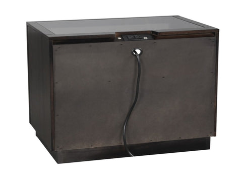 The striking profile of the Larchmont Collection is an intersection of texture, material and style. Dark glass tops night stand for subtle reflection and textural interest. Prominent horizontal metal hardware is mounted on each drawer front, and is finished to complement the tone of the charcoal finish over ash veneer. The night stand open concept of the drawer features not only the aforementioned glass top, but also underside LED lighting and power strip – with USB port- for the ultimate modern touch. PRODUCT DIMENSIONS: Overall Dimension: 28" x 18" x 28"H Drawer interior: 22.5" x 11.5" x 4" (2) Shelf interior: 24" x 15" x 7" (1) Listing Includes: One Nightstand Only. Simple Assembly Require.