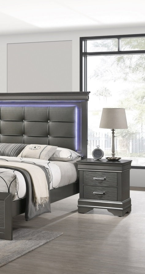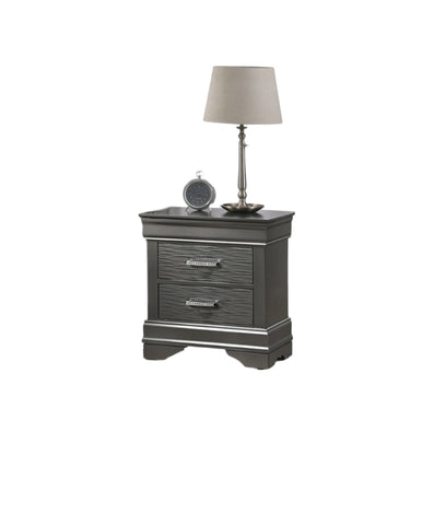 Description :- Organize your essentials effortlessly with the two spacious drawers, offering a convenient storage solution while maintaining a sleek and streamlined look. The drawer handles showcase a sophisticated design, adding a touch of luxury to your space. The thoughtful curves on the top and bottom of the frame provide a unique and charming aesthetic, making this nightstand a standout piece in any bedroom. Whether you're looking to upgrade your bedroom decor or enhance the functionality of your space, this Nightstand is the perfect choice. Pair it with the matching Chest, Dresser, Mirror, and Bed.