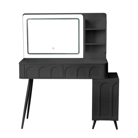 Flexible Storage Solutions: The dresser offers ample storage options, including a large tabletop, storage shelves beside the mirror, two large drawers in the side cabinet, and two additional drawers in the table. This versatile design keeps everything neatly stored and easily accessible, streamlining your daily beauty routine. The large tabletop provides ample space for your makeup, brushes, and other essentials.