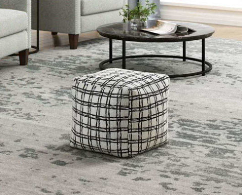 Whether the Misty Collection serves to provide stylish accent to your home’s décor, convenient seating when the need arises, or as perfect place to put up your feet, the square accent pouf’s versatility of purpose makes it a convenient addition to your space. The pouf is covered in a patterned black and white jacquard fabric upholstery.
