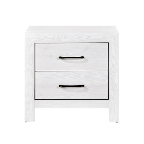 Modern lines and rustic styling are paired to create the look of the Corbin Collection. The 3D printed paper veneers texture is highlighted by a white finish for a realistic wood look. Providing complementing contrast, the drawer fronts of the nightstand feature black metal hardware. Subtle framing defines the profile of the nightstand, further lending to the unfettered design of the collection.
