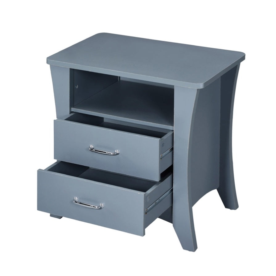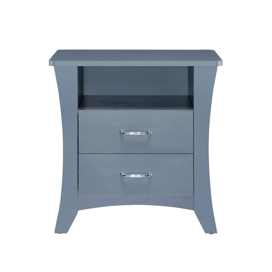 Add whimsical style and plentiful storage to your bedside with this contemporary gray nightstand. Two drawers create ample space for nighttime essentials while an open shelf is ideal for decor or a selection of books. It boasts curvy trim and a curved apron, offering a subtle but stylish ambiance to the piece. Drawer fronts boast silver-toned bar pulls with understated detail that brings a sophisticated finishing touch.