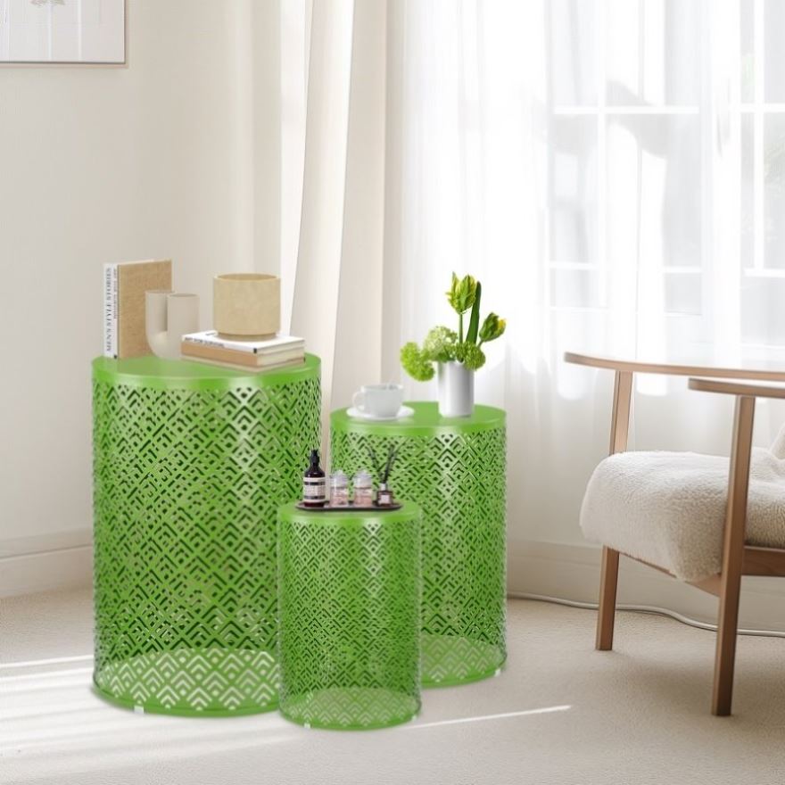 Add both function and style to any indoor or outdoor space with this Set of 3 Outdoor Nesting Side Tables. Crafted from high-quality metal with a smooth, easy-to-clean surface, these tables are built to resist rust and provide long-lasting use in all environments. The three different sizes are designed to meet a variety of needs—whether used as end tables, plant stands, or decorative accent pieces. Lightweight yet sturdy, each table features a unique metal cutout design that casts beautiful light and shadow patterns, enhancing the look of your patio, balcony, living room, or bedroom. Functional, decorative, and easy to move, this nesting set is the perfect addition to any setting.