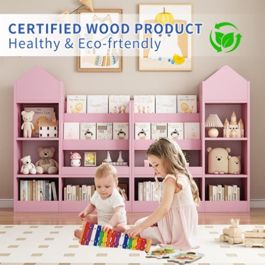 Pink Kids Wooden Bookshelf Toy Storage Organizer with Bookcase, Kid's Bin Storage Unit with 6 W2876P233556