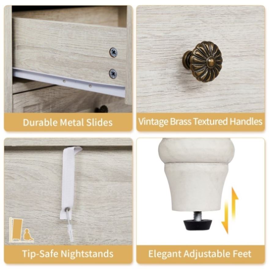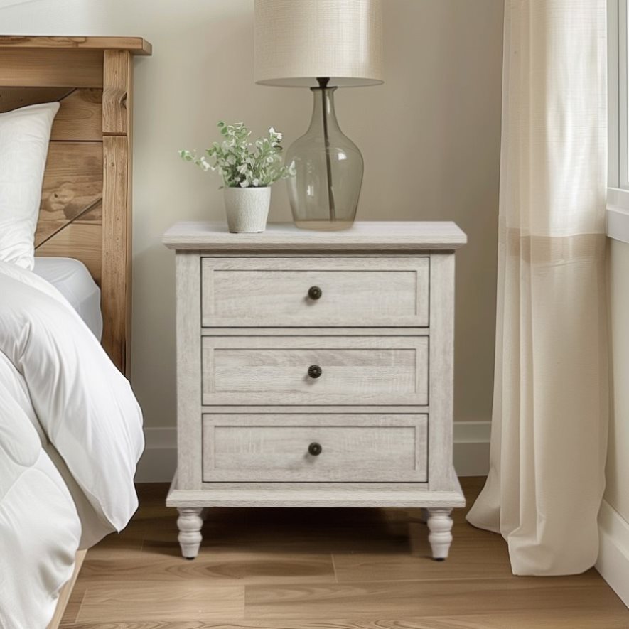 The nightstand features a high-quality 3D paper laminate that mimics the texture of real wood, giving it a classic, rustic appearance. The distressed white finish adds a timeless charm, making it a perfect match for farmhouse, shabby chic, or traditional interiors. The surface is scratch-resistant and easy to clean for long-lasting beauty. -