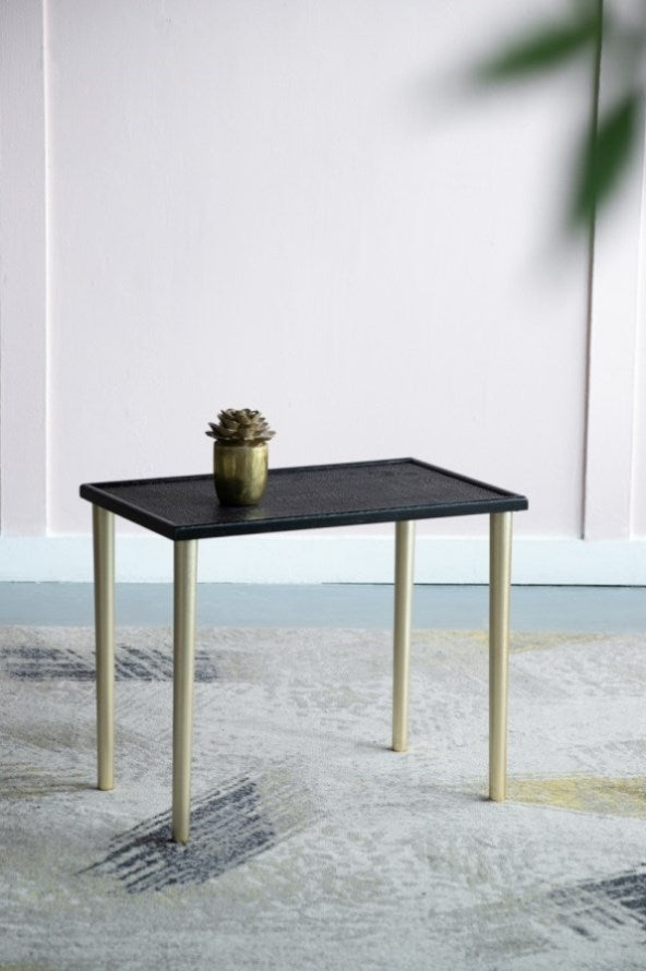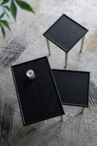 Inspired by bohemian handicrafts, this set of three nesting tables is a modern update that will enhance any room in your home. The dramatic black finish, woven rattan panels on the top, and golden legs provides the perfect balance. A blend of form and function that offers surface space that adusts to your needs.