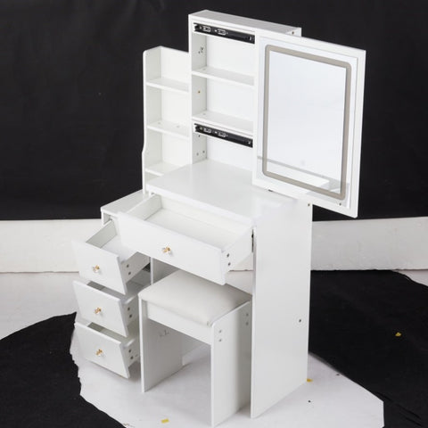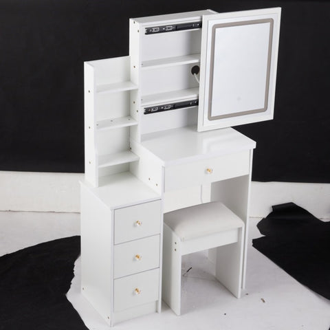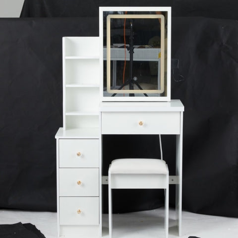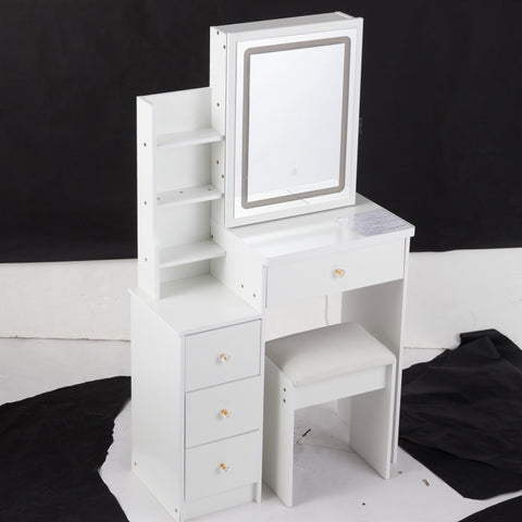 Small Size Left Bedside Cabinet Vanity Table Cushioned Stool, Touch Control Sliding LED Mirror, W936P226033