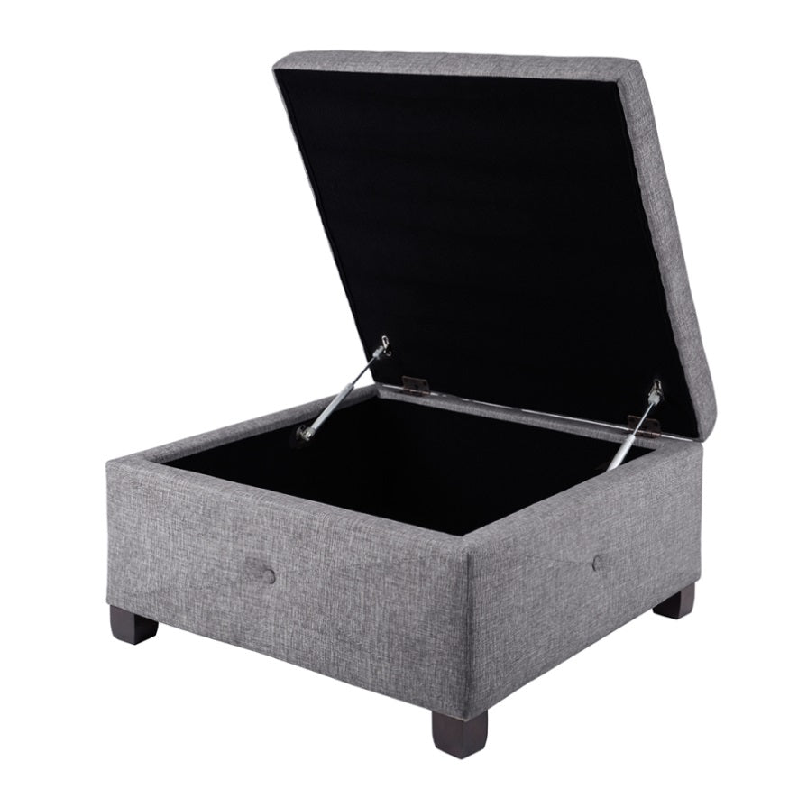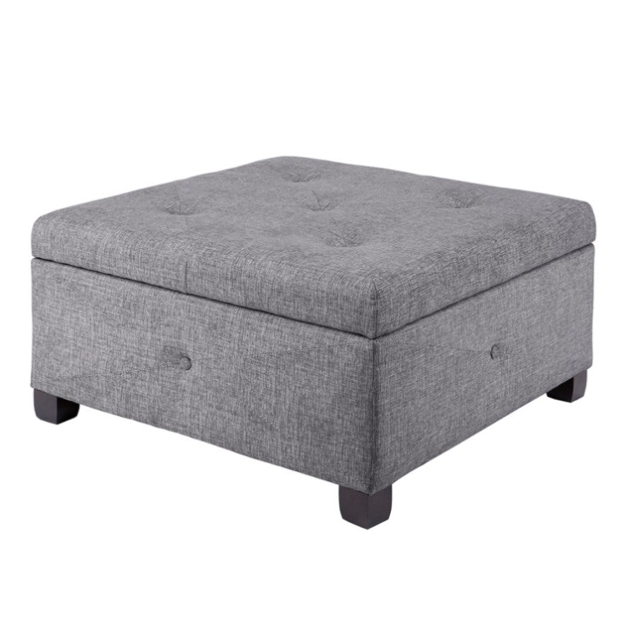 The Madison Park Aspen Ottoman offers a versatile storage option that's full of style for your home. This square storage ottoman is upholstered in a charcoal color fabric and features button-tufted details on the top and sides that add an elegant touch. Solid wood legs with a black finish complement the upholstery. Providing ample storage space for your blankets and other essentials, this upholstered ottoman makes a great addition to any room in your home. Assembly required.